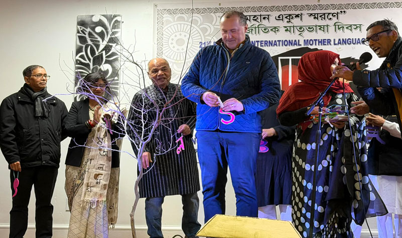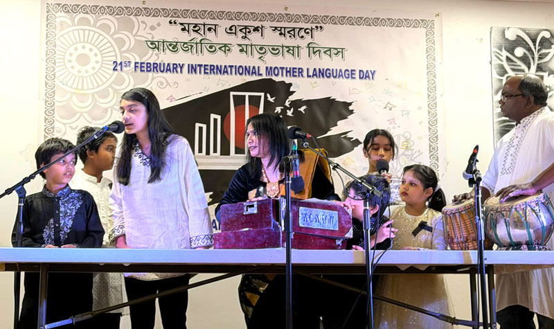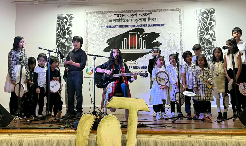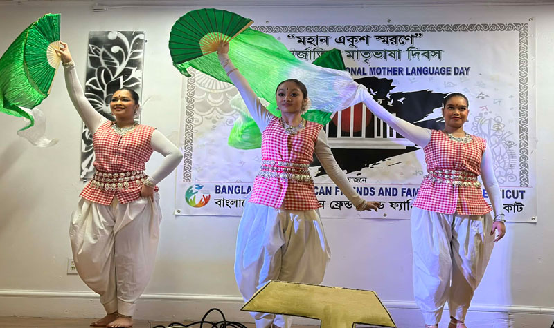 The February 21 event in Manchester began with the national anthem of the United States followed by the national anthem of Bangladesh. Cultural performances featured Kausholy Ema, director of Sangeet Academy, along with her students, Shuddhaswar director Shanta Nag and her students, Anondodhoni from New York,